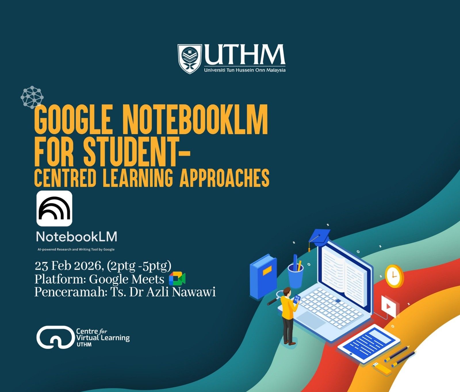 This workshop featuring Ts. Dr. Azli Nawawi (FTK UTHM) highlights Google NotebookLM for AI-assisted research synthesis, interactive study tools, and collaborative learning to boost classroom engagement and student-centered pedagogy.