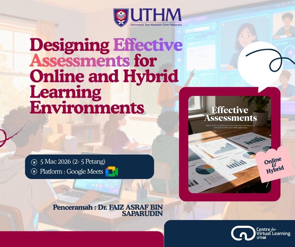 Led by Dr. Faiz Asraf bin Saparudin (CAD & TVET, UTHM), this program highlights modern assessment design for online and hybrid learning. Participants gain practical insights into using digital tools to create fair and interactive evaluations that go beyond traditional methods to foster student engagement and continuous improvement.
