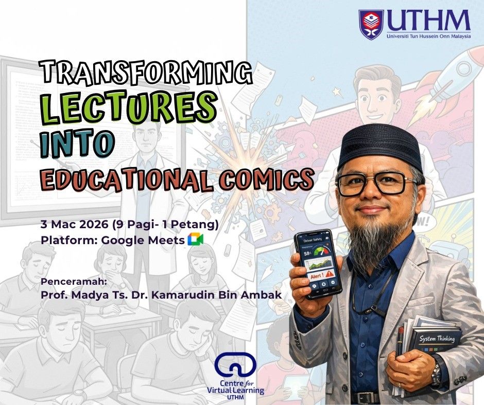This session featuring Assoc. Prof. Ts. Dr. Kamaruddin Ambak (FKMP UTHM) highlights transforming lectures into educational comics using AI-driven storyboarding and visual narratives to simplify complex concepts, boost student engagement, and provide a dynamic tool for deeper understanding.